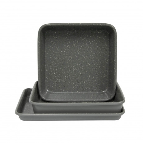 - Includes a 7 x 0.75-Inch Square Pan, a 9 x 6-Inch Cookie Sheet and a 8 x 6 x 1.5-Inch Rectangle Pan. (Interior pan dimensions)