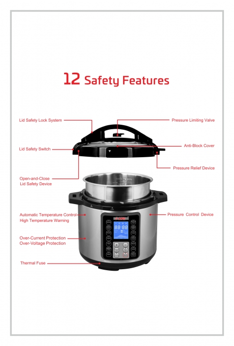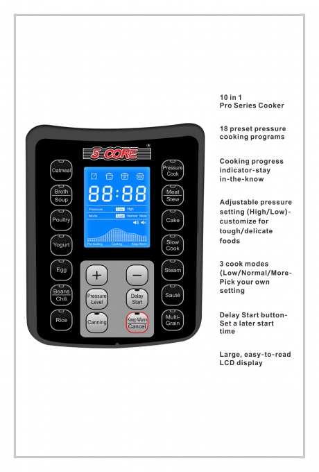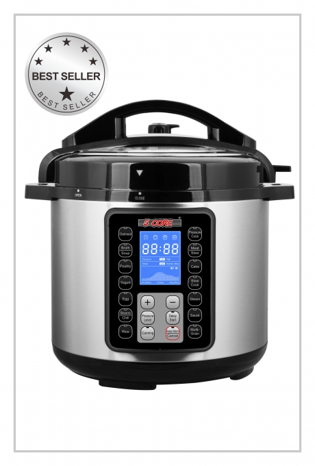• 10 APPLIANCES IN 1 & 18 PRESET SMART PROGRAMS – Unlike most other Hot-Pots on the market, 5 Core Pressure Cooker gives you the flexibility to manually input cooking times when required and you also have the pre-programmed smart programs already set for many dishes such as Oatmeal, Broth/Soup, Poultry, Yogurt, Egg, Beans/Chili, Rice, Pressure Cook (Manual Setting), Meat/Stew, Cake. Slow Cook, Steam, Sauté, Canning & Multi-Grain so all your favorite dishes are as easy as pressing a button• NEXT GENERATION ELECTRONIC CONTROLS - Built with the latest generation technology, microprocessors monitor pressure, temperature, keep time and adjust heating intensity and duration to achieve your desired results every time. CE certified with 8 safety mechanisms in place to provide you with added assurance, designed to eliminate many common errors.• 2 DISHES SIMULTANEOUSLY & ACCESSORIES INCLUDED- We have included a BONUS Stainless Steel Steamer Basket which allows you to cook your food quickly, consistently and efficiently, as well as an extra silicone gasket, ladle and measuring cup saving you time and money!• STRONGEST & HEALTHIEST - Ceramic non-stick interior coating, plastic PTFE and PFOA free for even heat distribution, fully sealed environment seals in the flavors, nutrients and aromas within the food to Healthy, stainless steel (18/10) inner cooking pot made from food grade 304 ss, no chemical coating, 3-ply bottom for even heat distribution, fully sealed environment traps the flavors, nutrients and aromas within the food• Unlike other models our cooker is made with high quality rubber seals, strong reliable heat resistant handles and internal electronics made to stand the test of time.FAST, EASY, AND SAFE!