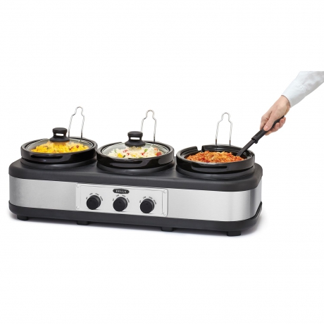Bella 2.5QT Triple Slow Cooker with Lid Rests, Stainless Steel. Durable stainless steel construction combines both style and functionality for cooking and serving. Cook and serve 3 different dishes at once using varying cook tempuratures and times. Three 2.5 quart oval shaped removable stoneware pots with spoon rests. 3 easy lid rests included; safe keeps lids while serving. Each 2.5 QT pot can serve 8-10 (3/4 cup) side servings