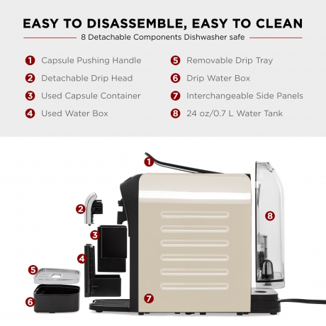 - DISHWASHER-SAFE & BPA-FREE: Capsule cartridge holds 10 used capsules and easily slides out to empty it. The drip head, drip tray, cup holder, and water tank all detach for easy cleaning in the dishwasher