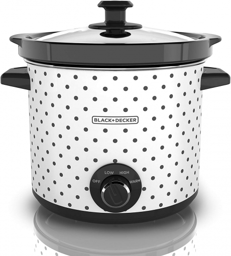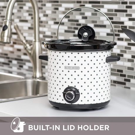 black+decker sc1004d 4 quart dial control slow cooker with built in lid holder, polka-dot black/white