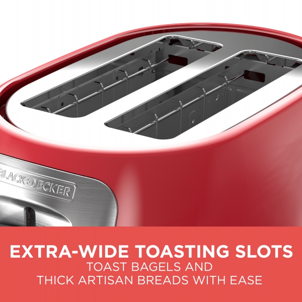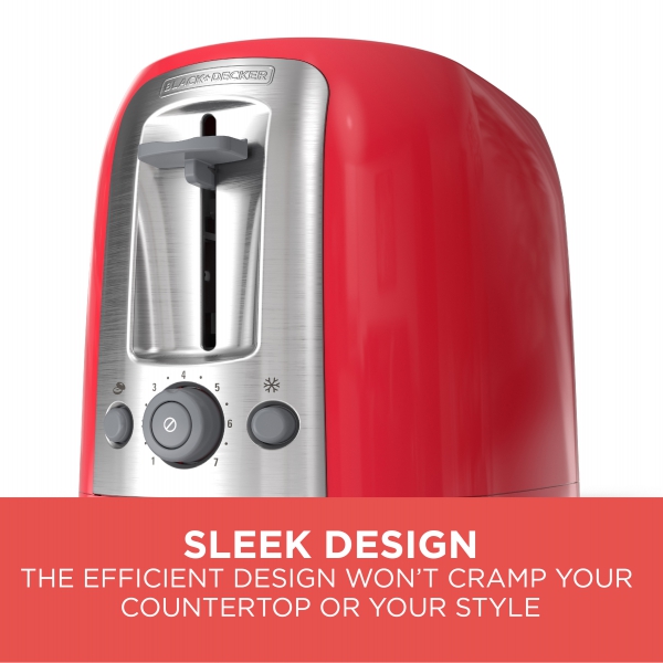 Breakfast just got easier. The BLACK+DECKER Red 2-Slice Toaster is the perfect way to start your day, with seven timed shade settings and special functions for bagels and frozen items. Plus, the extra-wide toasting slots accommodate bagels and thick cuts of bread, and the extra lift lever puts hot toast safely in reach. Do breakfast better with the BLACK+DECKER Red 2-Slice Toaster.
