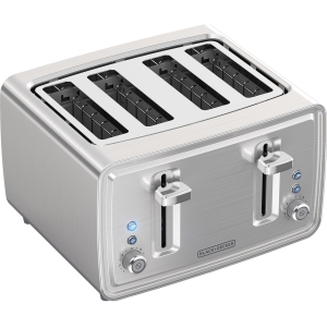 The Black & Decker Silver finish 4-Slice Toaster features easy controls and fast results. You can toast all types of breads, waffles, and pastries fresh or right out of the freezer with easy-to-use controls for bagel and frozen modes. Plus, extra-wide slots accommodate thick artisan breads and bagels, and the extended lift lever makes it easy to retrieve toasted items. The brushed stainless steel finish looks great on any kitchen countertop. 4 Toasting Slots. Three Functions - Extra-Wide Toasting Slots, Extra Lift 7 Shade Settings, Pull-Out Crumb Tray. Brushed Stainless Steel Finish.