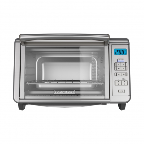 At-home cooking just got easier with the BLACK+DECKER 6-Slice Stainless Steel Digital Convection Countertop Toaster Oven with Broiler Pan. With a large interior and 20% faster* cooking times than previous models, the seven dedicated cooking functions quickly perfect everything from 12”pizzas to reheated leftovers. Intuitive digital controls make it easy to set the time, temperature, and cooking function, and the 120-minute timer features stay-on and auto-shutoff functionality. Convection technology circulates air within the oven for fast and even results while baking. Plus, the toaster oven includes a broiler pan and an external crumb tray that slides in and out, making cleanup a breeze. When it’s time to eat, trust the #1 brand in toaster ovens**—BLACK+DECKER. *Compared to BLACK + DECKER TO1660B. Three rack positions bake an entire chicken or finish steaks right under the broiler! The included rack slides in to three different positions for flexible cooking. Bake/broiler pan don’t worry about finding pans to fit in the oven. The included baking/broiling pan fits perfectly, making it easy to insert and remove food. Toasting rack also included.