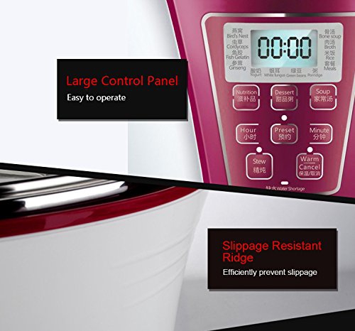 15 Built in Smart Programs: Bird's Nest / Cordyceps / Fish Gelatin / Ginseng / Bone Soup/ Broth / Rice / Meals / Yogurt / White Fungus / Green Beans / Porridge / Stew / Preset / WarmJug