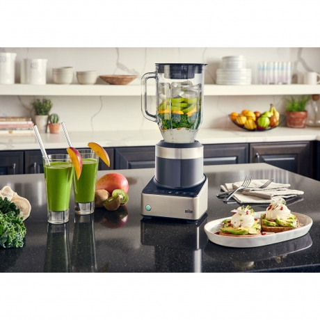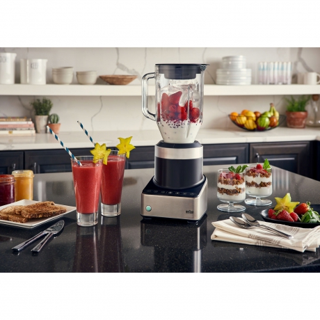 Even the hardest ingredients dont stand a chance against the PureMix Power Countertop Blender with glass blending pitcher, which leaves virtually no chunks in sight. With 1,000 watts of power, the this is our most powerful blender yet. Brauns Metal Power Drive gearing means more durability and gear engagement for superior blending performance. Three key program selections - Smoothie, Chop and Ice Crush - let you perfect your blend, and three speeds give your recipe the right touch. When you want a quick burst of power, three Pulse speeds provide control to produce a range of textures from chunky to smooth. The thermal-resistant glass blending pitcher allows easy switching from hot to cold without the risk of thermal cracking. Cleaning is also a breeze with removable blades and a wipe clean control panel. Finally, power, convenience and style have combined in one dynamic blending machine and its the perfect mix!