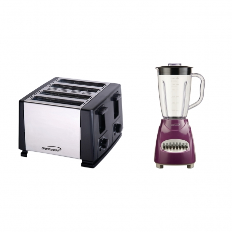 Every kitchen can have the best appliances thanks to this kit from Brentwood Appliances. This kit includes one 50 Ounce 12-Speed + Pulse Blender with Glass Jar and one 4-Slice Toaster. The 50 Ounce 12-Speed + Pulse Blender with Plastic Jar uses stainless steel blades to easily crush and pulverize ice. Choose between 12 speeds to blend delicious smoothies, thick shakes, hearty protein and more! This purple blender includes a 50 oz. dishwasher-safe, BPA-free jar and lid and convenient cord storage. The 4-Slice Toaster fits easily on countertops and makes it simple to toast up to 4 slices of bread at one time. This toaster also features slide-out crumb trays and 2 knobs with 6 different browning levels so you can ensure that your toast always comes out perfect. This easy-to-use appliance will quickly become a family staple! Each unit comes with a 1-year limited warranty.