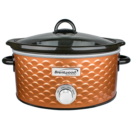 The Brentwood SC-140C Scallop Pattern 4.5 Quart Slow Cooker creates delicious meals while you tackle your busy day. Simply place your ingredients and come back to a hot and ready meal. Removable tempered glass lid and lead free, FDA approved inner pot are dishwasher safe. Premium copper scallop pattern exterior looks great on any countertop.