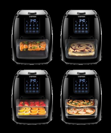 This versatile product functions as an air fryer, rotisserie oven and dehydrator, perfect for nearly any cooking task. Make better-for-you fries that are just as crispy and tasty, roast a whole chicken, or dehydrate that leftover pineapple you?ve been meaning to eat. ?This multi-functional airfryer cooks faster than an oven and does not require preheating. The capacitive touch screen display is easy to use; temperature range of 90-400 degrees and 8 preset options make any kitchen task easy