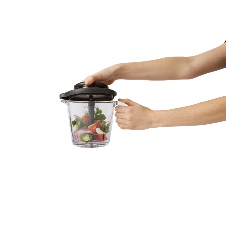 Designed to make any chef instantly an expert, the VeggiChopâ„¢ Pro Manual Food Processor utilizes our patented chopping mechanism and elevates it with the addition of stainless steel accents and a larger glass body. It effortlessly chops through vegetables, nuts and herbs without a bolt of electricity.