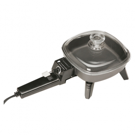 Features: -Electric skillet 6" surface for cooking and serving as a warm buffet tray. -A non-stick surface and adjustable temperature control to cook with ease. Removable handle for easy storage.. -Tempered glass lid lets you see how the food is cooking without splatters. -Durable black body and quality workmanship with 6" x 6" cooking surface. -Measures: 8.95 x 7.45 x 6.2", 600W Power. -UL Listed, and 1 Year Limited Warranty. Finish: -Black Enamel. Material: -Metal. Product Type: -Electric skillet. Dimensions: Overall Height - Top to Bottom: -6.2". Overall Width - Side to Side: -7.45". Overall Depth - Front to Back: -8.95". Overall Product Weight: -2.95 lbs.