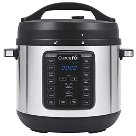 Pressure Cook, Slow Cook, Brown/Sauté, Boil, Simmer, and Steam with the Crock-Pot Express Easy Release. With 13 One-Touch Programs, you can pressure cook foods up to 70% faster than a conventional oven, or slow cook for delicious, hot meals ready when you are. New functions like Manual Pressure, Simmer, and Boil will take your cooking to the next level! Customize recipes with your own pressure setting and cook time using Manual Pressure. Select Simmer to cook gently and slowly or thicken sauces, and Boil to create more one-pot dishes. Also, enjoy convenient features like Delay Timer and the Status Bar that illuminates to track pressurization and preheat progress before cooking begins. Easily prepare any recipe on the menu using one versatile appliance! On most electric pressure cookers, your hand gets close to the steam when releasing pressure. With Crock-Pot Express Easy Release, your hand stays clear of the hot steam without the fuss of oven mitts and kitchen utensils. Delay the start of cooking for hot meals that fit into your schedule and use the Status Bar to track the progress of pressurization and preheat before cooking begins.