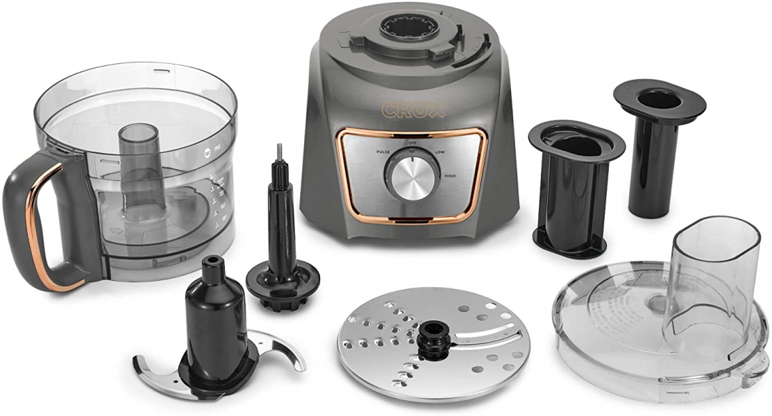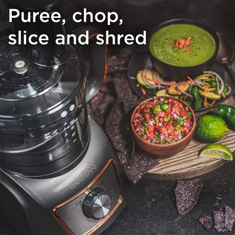 Get help chopping, dicing, mincing and pureeing big batches of food quickly with this powerful 8-cup capacity food processor by Crux. Variable speed control and reversible slicing and shredding discs provide you with the processing options you need to speed through prep work.
