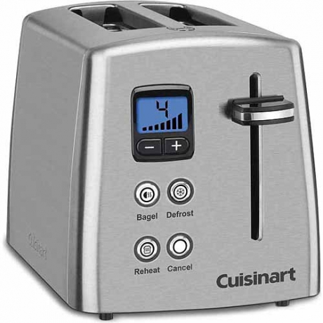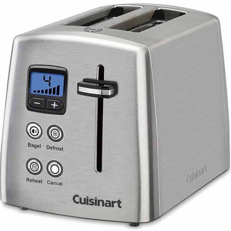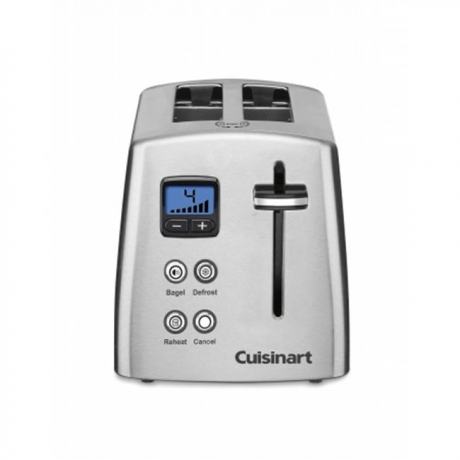 The Cuisinart 2-Slice Toaster provides many toasting options. It features separate controls so you can defrost waffles before toasting, reheat toast and reduce heat on the uncut side of bagels. With seven browning settings, you can adjust the metal toaster so it prepares your food just how you want it. It also has self-adjusting 1-1/2" wide slots to ensure that both thick and thin slices are toasted as desired. The Cuisinart Countdown toaster has a blue backlit LCD display. A removable crumb tray is also included to make clean up and maintenance a breeze. Add this handy appliance to your kitchen and toast bagels, muffins, toast and more. Its simple style easily matches with all types of appliances and home decor.