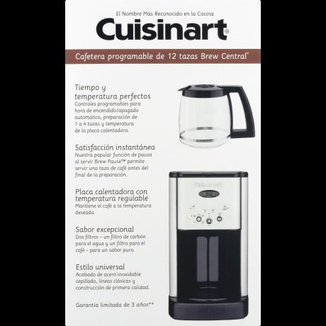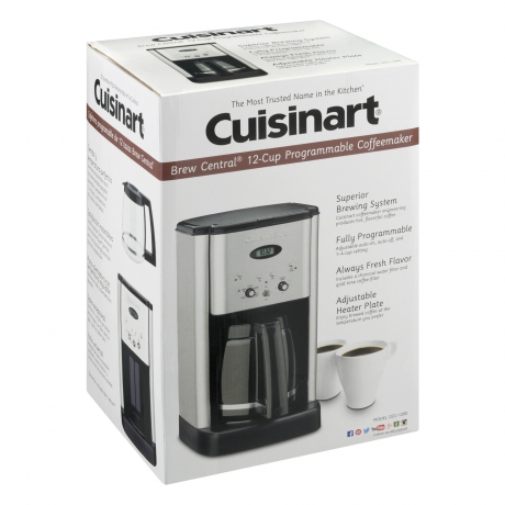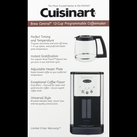 The Cuisinart Brew Central Coffeemaker makes a bold statement with a brushed metal finish and an elegant tech-industrial design. Programmable from start to finish, with a variable heater plate for temperature control, it's the ideal coffeemaker for today's demanding consumer.