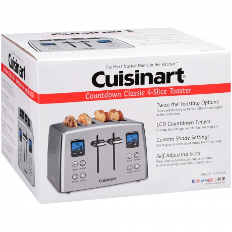 Make toast just how you want it with this Cuisinart Toasters 4-Slice Compact Toaster in Silver CPT-435. It features separate controls for a variety of tasks. Stainless steel housing gives it a shiny and attractive look while providing sturdiness. Use this toaster to defrost frozen waffles, reheat toast without further browning and even reduce the heat on the uncut side of a bagel. It features multiple slots to hold up to four slices at once. They can self-adjust to fit thick and thin pieces alike. This stainless toaster features seven browning settings to better customize the level of toasting. A pair of built-in displays count down the minutes left before the toast is ready. The screens and buttons are backlit with blue LEDs for easy reading. With a removable crumb tray, this Cuisinart four-slice toaster is easy to clean out after each use. It is free of BPAs for greater safety in the kitchen.