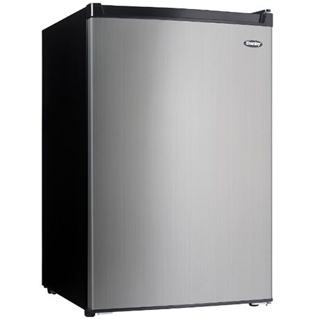 Danby 4.5 cu. ft. Single-Door Compact Refrigerator with True Freezer in Stainless Steel. This compact refrigerator by Danby offers 4.5 cubic feet capacity with a sleek stainless steel finish. It includes a full-width true freezer section (operates at -18°C) to ensure your ice cream and perishables are kept frozen and comes Energy Star rated. The reversible door and smooth-back design allow this unit to fit neatly in a variety of spaces. And the adjustable glass shelves make clean up easy if spills occur. Perfect for dorms, offices, or rec rooms, this Danby compact refrigerator with true freezer is the ultimate single-door mini fridge.