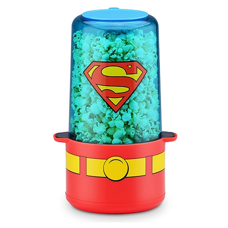 Bring justice and power to your movie nights with the Superman Stir Popper. The Superman stir popper can make up to 6 cups of popcorn in under 5 minutes. Comes with a set of measuring cups and a lid that doubles as a bowl for super fast and easy operation. Once popping is complete, simply secure the vent cap and flip the cover over to use as a serving bowl.