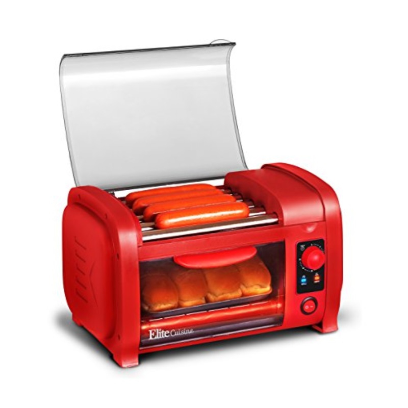 The red Elite EHD-051R Cuisine Hot Dog Roller Toaster Oven Combo has 5 stainless steel rollers grill hot dogs evenly. Aluminum tray warms buns and cooks snacks. Features see through oven door and cool-touch handle. Rolling grill and heat indicators and a 30 minute timer with bell indicator and auto