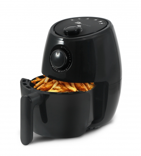Prepare healthier food using little to no oil Fried foods are crispy outside and moist inside Cook up to 1.5lbs of food per batch Faster than conventional cooking methods Adjustable time and temperature knobs give you ultimate control and versatility when cooking 2.1Qt. capacity Drawer Pan holds up to 1.6lbs of food Cool touch pan handle allows you to safely and easily remove the pan after cooking Heating elements create even hot air circulation for perfectly cooked results 30 minute timer with auto shut off Heating indicator light Overheat protection Adjustable thermostat control up to 395°F Non-stick coating for removable pan & frying rack 1000 watts Includes bonus recipes Manufactured in China ETL approved The Drawer Pan and rack are dishwasher-safe (top rack only). Clean the inside of the appliance with hot water and a non-abrasive sponge.
