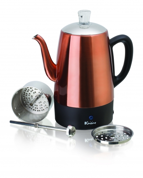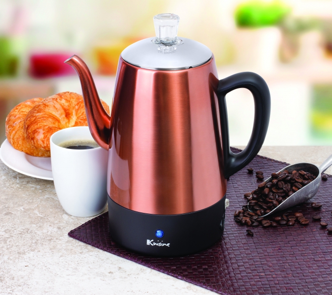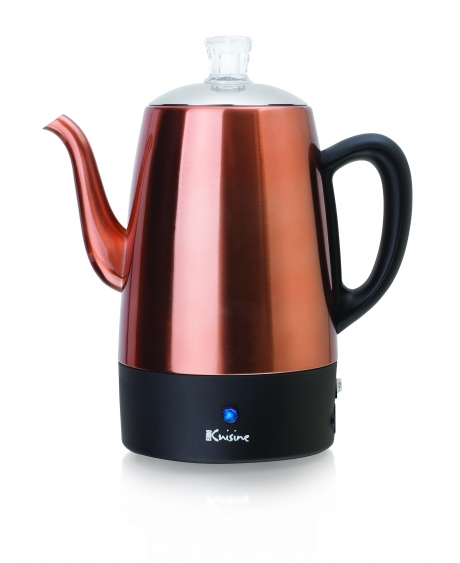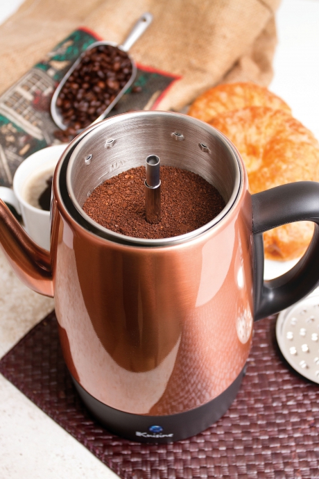 Wake up every morning to the rich, fresh aroma of perfectly brewed coffee with Euro Cuisine beautiful copper finish coffee percolator. This traditional style percolator quickly makes 4-8 cups of your favorite coffee in minutes. Just fill the percolator with water using the water fill level indicator, add your favorite coffee, and turn on the power switch. A built-in LED indicator light illuminates when your coffee is ready to enjoy. The percolator requires no coffee filters to buy or replace. Durable stainless steel construction is easy to clean while the stylish design makes it a welcome addition to any kitchen or office.
