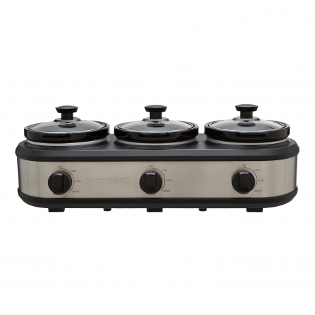 The Farberware Triple Slow Cooker is the perfect cooking accessory for multi-course meals, parties, and entertaining. Durably constructed from stainless steel and plastic, this amazing slow cooker is great for preparing three 1.5 quart dishes separately with just one appliance. This slow cooker lets you create your very own sauces, fondues, soups, chili, and more without having to overwhelm limited cooktop space. Featuring three temperature settings, you can keep up to three different dishes warming or slow cooking on high or low all day long. Each glass lid and ceramic pot is dishwasher safe to make clean up easy. The Farberware Triple Slow Cooker makes a great gift for birthdays, Christmas, Hanukah, housewarming, wedding showers, anniversaries, and other occasions.