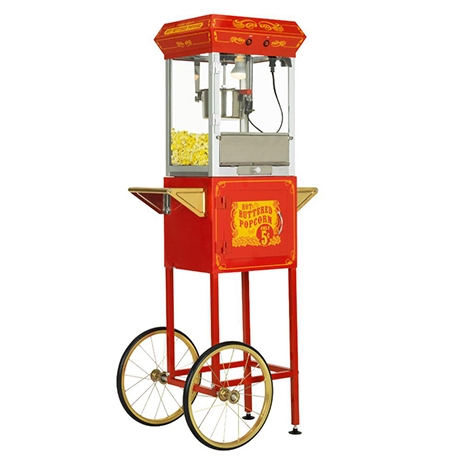 This popcorn machine yields about 1 gallon of popcorn. Perfect for birthday parties, movie nights, game days, backyard barbecues, school/ work events, and more! Heats up quickly and evenly to maximize the amount of kernels popped. Free-moving lid allows the popcorn to flow easily. Kettle detaches for easy cleanup. All-metal frame, stainless steel panels, and impact-proof doors ensure that your machine runs flawlessly and serves your family for years. Seasoning shaker, popcorn & oil measuring cup, and popcorn serving scoop are all included in the box. Large, bicycle-style wheels allow for smooth mobility and easy portability. This model can be used with or without the cart — the popcorn machine is detachable and can be placed on counters and bar/tabletops. Keeps the interior of the machine at a constant temperature to ensure your popcorn stays hot and fresh for hours. 1st switch controls the spot light and deck warmer. 2nd switch controls the kettle stirrer and kettle heater. Cutouts in the deck of the unit allow for easy removal of unpopped kernels. Simply open the tray to remove kernels and small debris. The handy storage cabinet is perfect for storing popcorn packets, oils, seasonings, and serving accessories. The side shelf is great for serving — simply set out your bowls/buckets/ bags and popcorn seasonings! Our machines work quietly and efficiently, using less power than competing models.