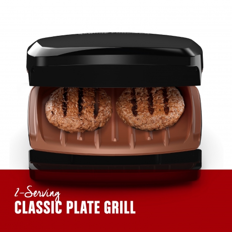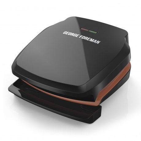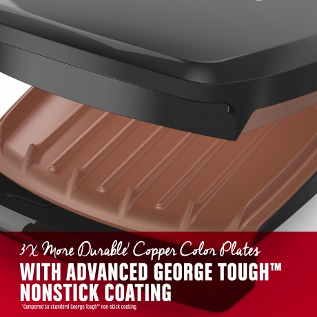 Looking for nonstick grill plates that last? Our nonstick copper color plates are 3x more durable1! That?s just one of the ways the George Foreman® 2-Serving Copper Color Classic Plate Indoor Grill and Panini Press makes cooking easy. The compact size is perfect for small kitchens, and vertical storage lets you fit the grill on the counter or in cabinets. Plus, the dishwasher-safe removable drip tray nests with the grill to capture grease for easy disposal. ^Compared to standard George Tough? non-stick coating *from 1/4lb. uncooked 80/20 ground chuck