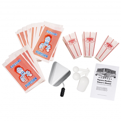 - Includes a starter kit: 25 free bags, measuring cups and a popcorn scoop with every popper