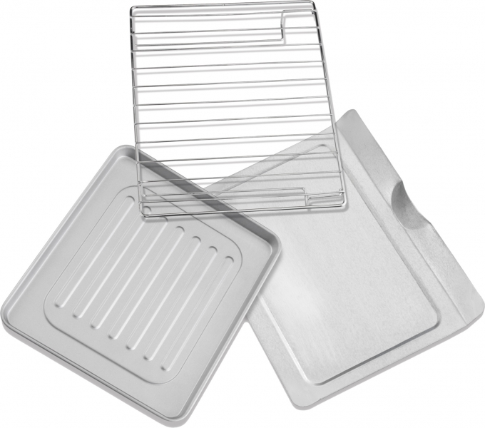 Includes oven rack, bake pan and a slide-out crumb tray that makes cleanup simple.
