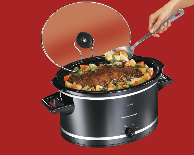 Everyone is so busy these days, with limited time for meal preparation. A slow cooker is the answer to cooking a delicious homemade meal. Perfect for larger families, the Hamilton Beach 8-Quart Extra-Large Capacity Slow Cooker can cook a 6 lb. roast or 8 lb. chicken. A family of four can save money by cooking one large meal and portioning the leftovers for reheating on another day. The oval shaped stoneware crock is versatile for a variety of foods. Preparation is very easy, simply place the ingredients in the crock, set the desired cooking temperature, and get on with your day. No watching or stirring is required. Cleanup is a snap with a dishwasher safe ceramic crock and lid.Hamilton Beach 8-Quart Oval Slow Cooker, Black:8-quart slow cooker ideal for large meals such as a 6 lb roast or 8 lb chickenFull-grip handles for easy carryingRemovable dishwasher-safe stonewareDishwasher-safe glass lidKeep warm, low and high settingsBlack metallic wrapKeep warm maintains the ideal serving temperature without over-cookingModel# 33184