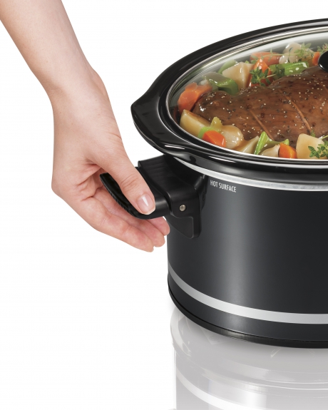 This slow cooker is just the right size for feeding a crowd, satisfying the appetite of a large family or batch cooking. The oval-shaped stoneware can fit a variety of foods, such as an 8lb. chicken or a 6lb. roast. The full-grip handles makes carrying the slow cooker from the counter to the serving table easy. When it’s time to put the slow cooker away, the handles fold down for easy storage. The removable stoneware and glass lid are both dishwasher safe, making cleanup a breeze.