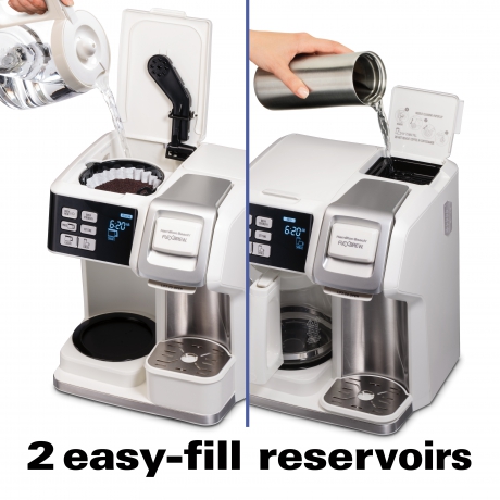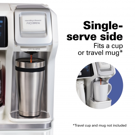 No two coffee drinkers are the same – so when you make Coffee at home the flexibility to customize how and what you brew is key From fresh grounds to K-Cup** pods the Hamilton Beach FlexBrew) 2-way Coffee maker gives you the options to please fans of all types of coffees and quantities This combo Coffee maker lets you brew a full pot using your favorite grounds on the carafe side or make a cup for yourself using a single-serve pod or grounds on the single-serve side Each side has an easy-fill water reservoir with separate windows so there’s never any confusion or over-filling You can also choose between regular or bold brew strength on both sides The full-pot side brews up to 12 Cups of Coffee using grounds It includes a Programmable clock with 2-hour keep warm cycle automatic shutoff and automatic pause and serve The single-serve side can brew up to 10 oz With a single-serve pod or fill a 14 oz Travel mug when using Coffee grounds A removable cup rest doubles as a storage container for single-serve pods or to hold the brew basket.