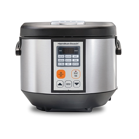 One cooker, endless possibilities. With a 4.5 quart capacity, the Hamilton Beach Digital Multi-Cooker combines the functions of a rice cooker, slow cooker, food steamer and more into a single compact appliance. Intuitive digital controls make switching between cooking methods effortless. Individual cook options make it easy to prepare white rice and brown rice plus hot cereals like oatmeal, grits and more. Low and high slow cook settings with steady and gradual heat offer the same results as a traditional slow cooker.Steam seafood, poultry or vegetables in the steam basket while rice or grains cook below, or steam them on their own. Sauté vegetables before adding grains for a risotto dish or simmer a batch of soup in time for family dinner. Glass lid lets you see your food and monitor the entire cooking process. Push-button digital controls makes switching between functions effortless. Includes Keep Warm and Delay Start options and a countdown timer. The nonstick inner pot is removable and dishwasher safe for easy cleanup. Convenient handles help lift it from the base comfortably. A steaming basket, rice paddle and measuring cup are included in the box.