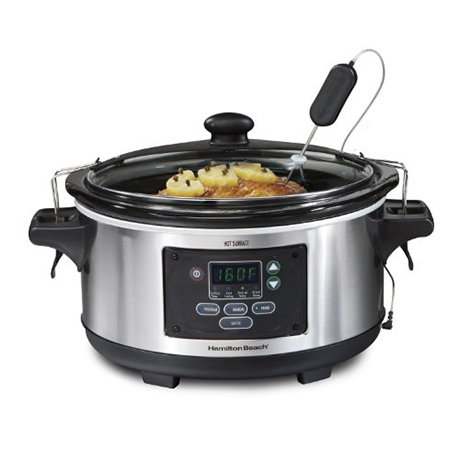 Eliminate weeknight stress with the Hamilton Beach Set & Forget Programmable Slow Cooker. With three choices for automatic cooking, having a family meal on a busy weeknight is easier than ever. What you make and how you prepare it are up to you. Three smart settings – probe, program and manual – allow you to cook foods to a specific temperature, for a set number of hours or on High, Low or Warm settings for up to 14 hrs. Smart technology allows you to cook a wide range of recipes to either a specific temperature when using the probe or to a desired cooking time. When your food is done cooking on either of these settings, the slow cooker will automatically switch to warm. The PROBE setting is great when cooking cuts of meat. What is even better? Seeing the food temperature inside the slow cooker displayed right on the screen. Set the slow cooker to the desired temperature, insert the probe into the meat and the slow cooker will automatically shift to warm when the desired temperature is reached. When your pot roast recipe will be done in 6 hours, but you won’t be home for 8 hours or more, use the PROGRAM function. Select the heat setting and cooking time. The slow cooker will automatically switch to warm when the cooking time is up, so your meal will be hot and ready to serve when you arrive home. It’s that easy. The MANUAL setting allows you to slow cook on High, Low or Warm heat settings, just like a traditional slow cooker you may have grown up with. When you need to take your home-cooked meal on the road, the slow cooker’s clip-locked, secure lid has a tight seal to help ensure that your shirt and your car arrive without a messy spill. The Set & Forget Programmable Slow Cooker is equipped with power interrupt protection, so during a momentary power interruption of 5 seconds or less, the slow cooker will remember the programmed heat and time settings and continue cooking. The 6 quart oval crock is the perfect size for a 6 lb. chicken or 4 lb. roast and so much more. It’s the perfect size for a home-cooked family meal.