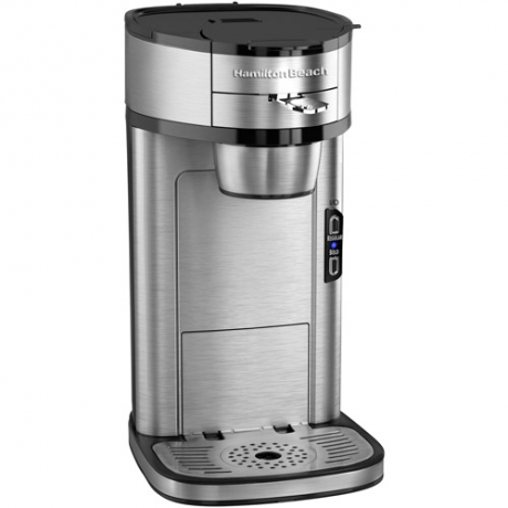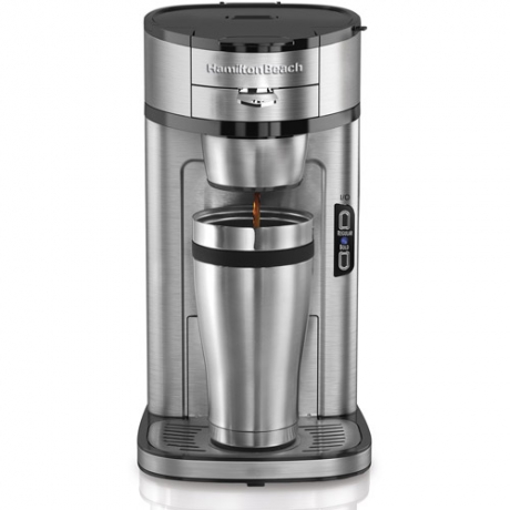 Hamilton Beach The Scoop Single-Serve Coffeemaker, 49981, Stainless Steel:Brews cup quickly: an 8 oz up in less than 90 seconds or a 14 oz cup in under 2.5 minutesUltra-simple preparation: scoop, place and brewSteel mesh scoopBuilt-in, adjustable standFits a cup or travel mugWide drip tray on baseSettings for Regular and Bold coffeeBrews hotter for better tasteDurable stainless steelAutomatically shuts off after brewing1-year limited warrantyModel# 49981