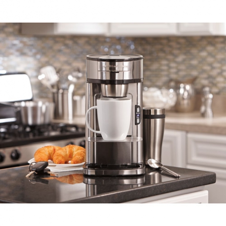 The Hamilton Beach The Scoop Coffeemaker goes where no coffeemaker has gone before, brewing hotter, faster and better-tasting coffee than most gourmet machines out there. Its benefits don't stop there ? this single-cup coffee maker utilizes the simplicity of ground coffee and brews a customizable cup quickly: an eight-ounce cup in less than 90 seconds or a 14-ounce travel mug in under two-and-a-half minutes. Aside from its versatility in using inexpensive coffee grounds to brew a great-tasting cup, this Hamilton Beach coffeemaker is designed for ultra-simple preparation in three straight forward steps: scoop, place and brew! It features a steel mesh scoop for filtering freshly ground coffee and comes with a built-in, adjustable stand that flips to accommodate a standard-size cup or a taller travel mug. All in all, this coffeemaker offers affordability and no fuss with lots of options. There's no need for extra equipment or high-tech buttons.