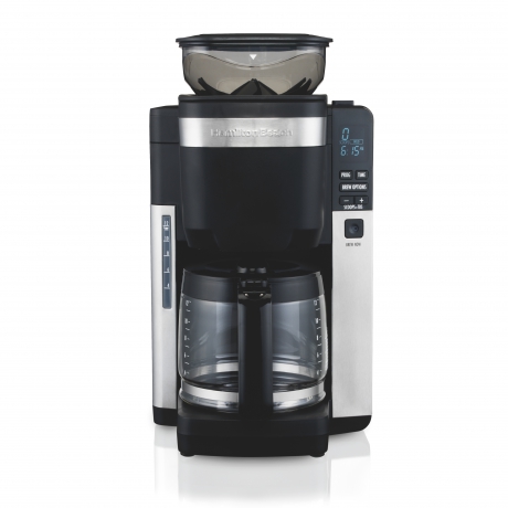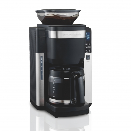 Hamilton Beach Auto Grounds Dispensing Coffee Maker Streamline the brewing process and get consistent coffee flavor.With the Hamilton Beach Auto Grounds Dispensing Coffee Maker, making coffee just got a whole lot easier. That’s because your grounds are automatically measured and dispensed into the filter with just a touch of a button. Plus, it remembers your scoop number so there’s no need to set it daily. That means you can get the same flavor and strength every time – no matter who makes it.The attached grounds container seals tight to help keep coffee fresh, and it holds up to 12 ounces of grounds. The coffee maker’s compact design makes it small enough to still fit under most standard cabinets, but it can brew up to 12 cups.While the Auto Grounds Dispensing Coffee Maker gives you consistent results, it also offers smart, flexible features, like programmable settings, three brewing options –regular, bold and 1-4 cup – and automatic pause and serve. A front-access water reservoir makes filling easier, and the swing-out brew basket has a sensor to let you know when the coffee basket needs to be cleaned out, so you won’t accidentally fill a used filter. Plus a cleaning cycle reminder lets you know when it’s time to clean your coffee maker.Top Bullets:AUTOMATIC GROUNDS DISPENSING WITH MEMORY. This coffee maker stores and dispenses the grounds for you and remembers the scoop number you previously selected. Store up to 12 ounces of ground coffee – the sealed container keeps coffee tasting fresh.CONSISTENT FLAVOR, NO MATTER WHO MAKES IT. Trust anyone to make the coffee the way you prefer - just select your preferred scoop number, add water and brew.EASY ACCESS FROM THE FRONT. Fill the water reservoir from the front of the coffee maker, not the back. View water levels in the window that’s on the front.SWING-OUT BREW BASKET WITH INTELLIGENT SENSOR. Brew basket opens with a push of a button, and an intelligent sensor alerts you if the basket needs to be cleaned out before dispensing grounds, so you never have to worry about accidentally auto filling into a used filter.12 CUP CAPACITY WITH BREWING FLEXIBILITY. Programmable timer with auto shutoff and optional clean cycle reminder. Brewing options include regular, bold, and 1-4 cups.