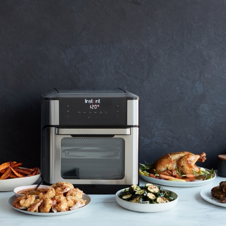 The Instant? Vortex? Plus Air Fryer is a multi-use countertop appliance that prepares dishes by circulating super-heated air around food, with little or no cooking oil, to achieve crunchy golden ?air fried? meals. The air fryer?s topside heating element and motorized fan rapidly circulates the super-hot air so food cooks evenly, and the incredible heat that flows around the dish locks in moisture and gives it that distinct deep-fried taste and texture. Because of the size of the cooking chamber and rapid air circulation, the cook time can be effectively reduced by 20% or more when compared to other cooking methods. The large 10 Quart capacity can fit both cooking trays at once, so you can cook for up to 6 people, and the roomy rotisserie cage is the perfect tool for easy, crispy, tender fries, wings, nuggets, and more. Air fry, bake, and roast multiple meals at once. Dehydrate purees made from fruits and berries, and sneak in some vegetables too?they?ll never notice! You?ll have delicious, healthy, preservative-free fruit leather in no time. If you?re more of a carnivore, the dehydrate setting also allows you to make DIY jerky from all kinds of meat?beef, fish, pork, poultry, game meats and more. Melt cheese on toast, reheat meals without drying out or overcooking, and use the rotisserie spit to make tender, juicy rotisserie chicken. A world of flavor at your fingertips. Fast, versatile, and convenient, let the Instant? Vortex? Plus cook all your family?s favorites exactly the way you like them. All the taste and texture of deep-fried cooking, without the grease! The Instant? Vortex? Plus is highly accessible, with a modern, bright white LED display and sleek black touchscreen. 14 simple touch controls are intuitive and easy to use and provide the flexibility to either cook with 7 preset Smart Programs, or, customize the time and temperature to cook manually. If you?re someone who likes to fine tune your cooking, the Instant? Vortex? Plus remembers your settings, so your favorite meals can be made with the touch of a button. Just set it and forget it!