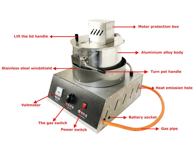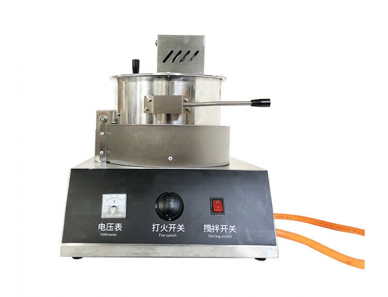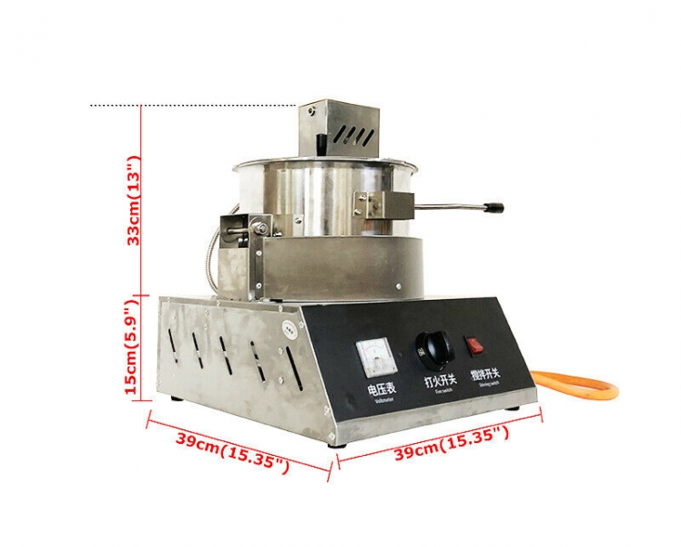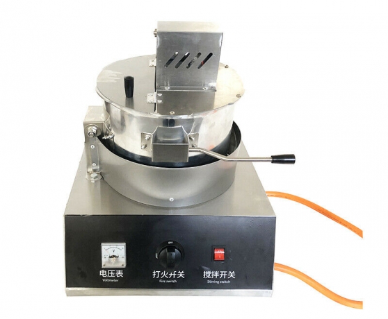 It is Gas heating, high efficiency. Temperature up to 1400 ℃. Stainless steel material. Popcorn full, more delicious. High production. Anti-hot hand design.