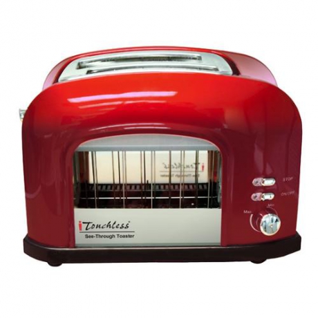 Candy-apple red see-through automatic toaster with Heat Scan technology. Toasts up to 2 slices of bread at a time. Automated self-elevating platform and adjustable temperature control for even toasting.