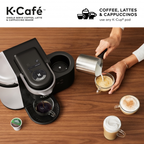 Enjoy the rich, full-flavored coffee you love or delicious coffeehouse beverages from the new Keurig K-Café single serve coffee, latte, and cappuccino maker. Whether brewing coffee, or making lattes, and cappuccinos, the K-Café brewer works with any K-Cup pod so the options are endless. Use the coffee SHOT to brew a concentrated shot of coffee and froth your choice of fresh milk to create a creamy latte or frothy cappuccino. Enjoy your latte or cappuccino hot or use the COLD setting for cold frothed milk to make a wonderfully refreshing iced latte or iced cappuccino. Brew 6, 8, 10, or 12oz of your favorite coffee, tea, or cocoa – select Strong Brew when you want a bolder cup of coffee. The dishwasher safe frother makes clean up a breeze – enjoying delicious specialty beverages at home has never been so easy. Just brew, froth, enjoy! Making a latte or cappuccino in just 3 easy steps: 1. BREW a coffee SHOT using any K-Cup pod. 2. FROTH your choice of fresh milk, including skim, soy, and almond in the dishwasher-safe frother. 3. ENJOY your creamy latte or frothy cappuccino. DISHWASHER SAFE FROTHER: Froth fresh milk, including skim, soy, and almond. The frother is dishwasher safe for easy clean up after use and also features a COLD setting for cold frothed milk.