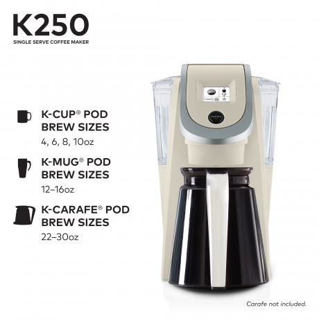 A Slim and Sleek Keurig Single Serve Coffee Maker, the Keurig K250 brews a rich, smooth, and delicious cup every time with the quality you expect from Keurig. With a strength control setting for a bolder brew, and multiple K-Cup, K-Mug, and K-Carafe pod brew sizes, you can customize your settings to get your perfect cup. Plus, an easy-to-use touch screen makes your brewing experience stress free. Whether you like your coffee strong, mild, decaf, or flavored, you can brew all of your favorites with the Keurig K250 ?Äì and with large 48oz water reservoir, you can brew 6+ cups before having to refill. Discover hundreds of K-Cup pod varieties from all of the brands you love, including Green Mountain Coffee, Starbucks, and Lipton, and enjoy coffee, tea, hot cocoa and more. Available in a variety of fun colors to complement any d?©cor, and also compatible with the Keurig Plus Series My K-Cup Reusable Coffee Filter, so you can brew your own ground coffee.