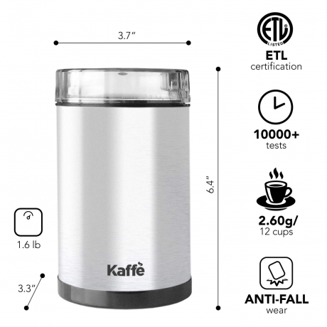 The KF2020 electric coffee grinder by Kaffe gives you a quick and efficient way to grind coffee beans down for use with a French press coffee maker or coffee dripper. Grinding coffee beans immediately before use releases the fragrant essential oils at the right moment to ensure maximum freshness, rich aroma for a full-bodied flavor and complex, satisfying coffee with the most delicious taste in the comfort of your own home. Capacity of up to 2.5 oz (70g) at a time delivers the correct amount of coffee grounds to use for with home or travel coffee dripper systems (Recommended with the Kaffè KF1010 French press). With its powerful motor and stainless steel blades, this electric grinder delivers coffee grounds to your preferred level of coarseness or fineness at the touch of a button. Thanks to the transparent lid, you can see the grinder at work and monitor your ground consistency. The appliance is easy to clean: Simply wipe parts with a damp, soapy sponge. The dishwasher-safe lid can be washed on the top shelf of your dishwasher. An attractive brushed stainless steel finish adds elegance to your kitchen. The perfect gift for any coffee lover, and a wonderful kitchen buddy for those who love convenience at their fingertips.