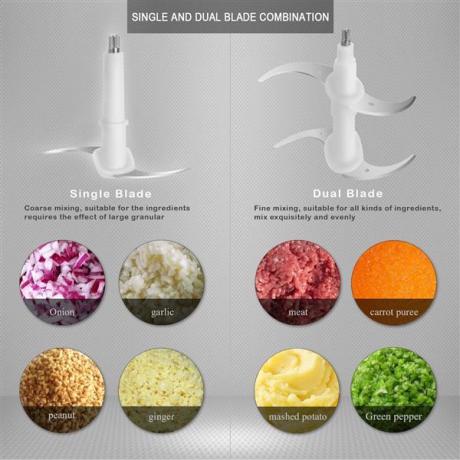 4 detachable stainless steel blades allows the upper and lower blades to chop food evenly. Chop vegetables in 6 seconds and chop meats in 8 seconds, making an indispensablehelper in your kitchen when having friends gathering or family reunion.