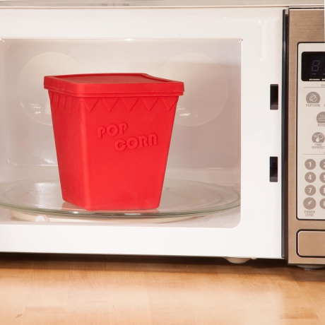 Enjoy a healthy, fresh-popped treat anytime--no air popper or special pans required! Thanks to this Microwave Popcorn Popper shaped like a cinema box, you can pop your own whole kernels. Simply add up to 1/4 cup of kernels, snap the lid of the popcorn maker closed and microwave. 100% silicone popcorn popper design resists heat, odors and bacteria, and is dishwasher safe for easy cleanup. Make popcorn in the microwave with this 5 1/3" sq. x 6" high popper. By Chef's PrideTM.