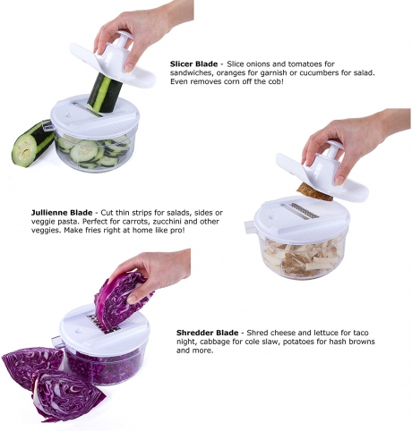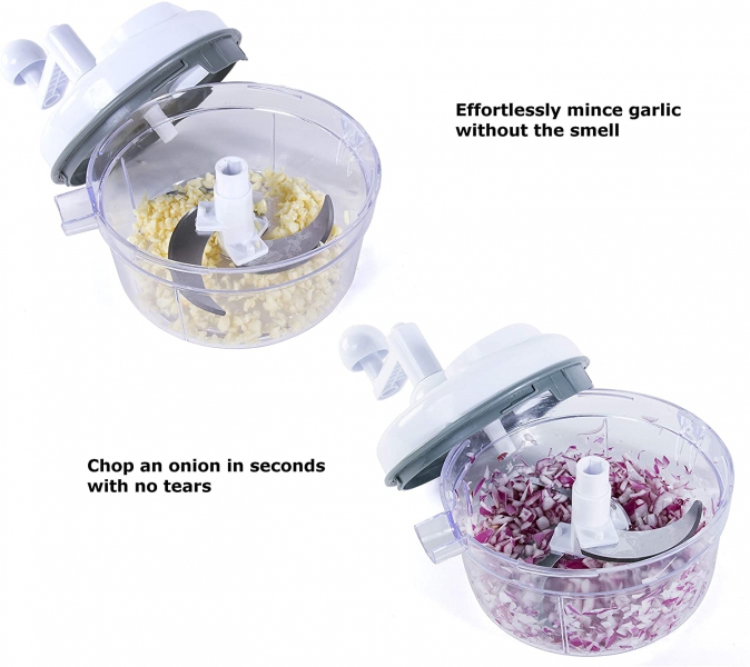 • VERSATILE – Perfect for slicing vegetables, chopping nuts, herbs, salsa, hummus, guacamole and more. Chop onions in seconds without crying and garlic without stinking up the kitchen. Chop veggies, shred cheese and make hash browns all with one tool! Manual operation allows you to achieve the consistency you want. Spin a few times for large chunks, spin more for smaller ones, and keep on turning if you want to puree the food.
