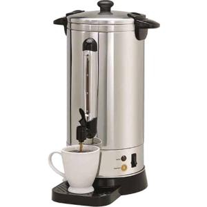 The NESCO Coffee Urn is constructed of stainless steel and features double wall insulation, allowing it to retain heat longer than single wall models. Its hefty capacity can hold up to 50-5.7 oz cups. Approximate brewing time is one cup per minute. Green indicator light lets you know when coffee is ready to be served. With locking lid and stay-cool handles to help prevent mishaps, this urn is truly a crowd pleaser.