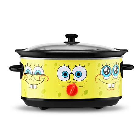 Spongebob becomes a convenient kitchen companion to all your culinary adventures. This manual slow-cooker makes it easy to prepare a wide range of menu items. Dinner is served after a full day of simmering in this family size slow cooker. The 7-quart capacity is ideal for homemade favorites like roast chicken, beef tenderloin, pulled pork, hearty stews and even desserts! Bring the star of the show off the screen and into your kitchen. The vibrantly yellow, goofy and optimistic faces of Spongebob adds character to any home. Use the low setting for all-day home cooking or start on high for a few hours and then shift to low. Use the warm setting to keep cooked meals at the optimal serving temperature. Take a quick peek through the glass lid to check the status of dinner. Then gently lift the ceramic insert from the base for easy serving. Even more convenient - the insert is dishwasher safe.