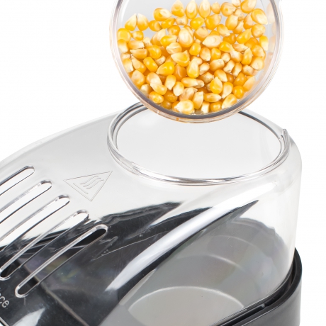 Poured in the appropriate amount of corn from the handy measuring cup/butter melter. Fired it up and wham popcorn kernels everywhere! Counter-top, bowl, floor, walls, you get the picture. The design flaw in this product is the small size. The original version was tall enough that the un-popped corn found its way back to the popping chamber while only the popped kernels escaped via air flow.